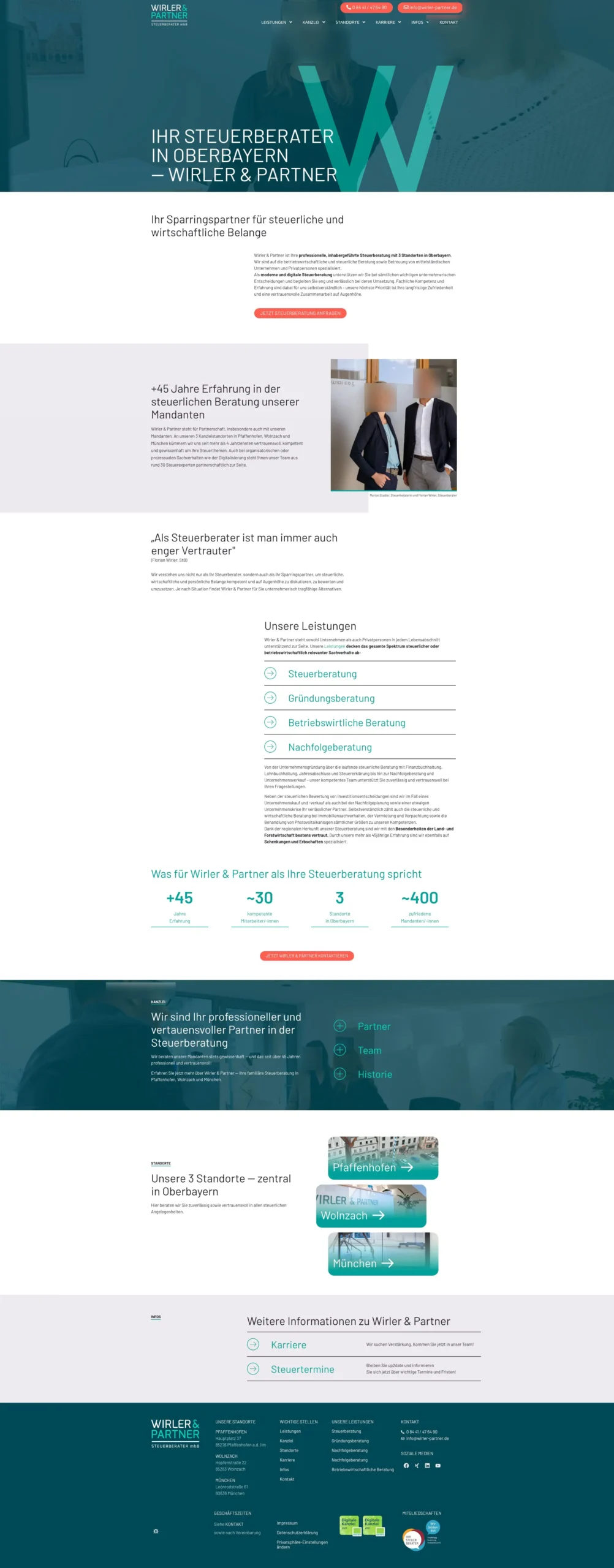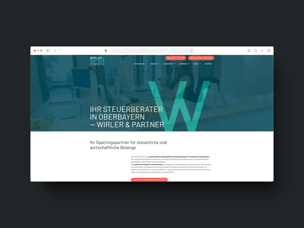 Dank des neuen CMS profitiert die Kanzlei von einer optimierten Benutzeroberfläche, die sowohl für Mitarbeiter als auch für Mandanten benutzerfreundlich ist. Die Pflege und Aktualisierung der Inhalte ist nun deutlich effizienter. Gleichzeitig konnten wir sicherstellen, dass alle individuellen Funktionen sicher integriert wurden. Das Ergebnis ist eine moderne und leistungsstarke Website, die sowohl die Tradition als auch die Professionalität von Wirler & Partner unterstreicht und die Sichtbarkeit im Internet weiter stärkt.